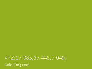 XYZ 27.985,37.445,7.049 Color is a normal lime color and the nearest color is Citron #9fa91f. Hex code #94b01f and RGB value is rgb(148,176,31). In RGB color space, this color is composed of 58% red, 69% green, 12% blue, In CMYK color space, this color is composed of 16% cyan, 0% magenta, 82% yellow , 31% black , In HSL color space, this color has a hue angle of 72° , 70% saturation and 41% lightness.