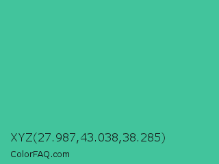 XYZ 27.987,43.038,38.285 Color is a normal green color and the nearest color is Ocean Green #48bf91. Hex code #42c49c and RGB value is rgb(66,196,156). In RGB color space, this color is composed of 26% red, 77% green, 61% blue, In CMYK color space, this color is composed of 66% cyan, 0% magenta, 20% yellow , 23% black , In HSL color space, this color has a hue angle of 162° , 52% saturation and 51% lightness.