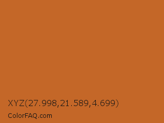 XYZ 27.998,21.589,4.699 Color is a normal orange color and the nearest color is Piper #c96323. Hex code #c46728 and RGB value is rgb(196,103,40). In RGB color space, this color is composed of 77% red, 40% green, 16% blue, In CMYK color space, this color is composed of 0% cyan, 47% magenta, 80% yellow , 23% black , In HSL color space, this color has a hue angle of 24° , 66% saturation and 46% lightness.