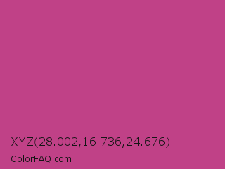 XYZ 28.002,16.736,24.676 Color is a normal magenta color and the nearest color is Smitten #c84186. Hex code #c04187 and RGB value is rgb(192,65,135). In RGB color space, this color is composed of 75% red, 25% green, 53% blue, In CMYK color space, this color is composed of 0% cyan, 66% magenta, 30% yellow , 25% black , In HSL color space, this color has a hue angle of 327° , 50% saturation and 50% lightness.