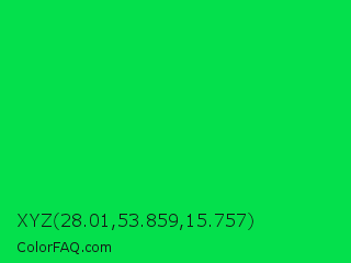 XYZ 28.01,53.859,15.757 Color is a normal green color and the nearest color is Malachite #0bda51. Hex code #04e04c and RGB value is rgb(4,224,76). In RGB color space, this color is composed of 2% red, 88% green, 30% blue, In CMYK color space, this color is composed of 98% cyan, 0% magenta, 66% yellow , 12% black , In HSL color space, this color has a hue angle of 140° , 96% saturation and 45% lightness.
