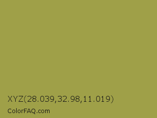 XYZ 28.039,32.98,11.019 Color is a normal yellow color and the nearest color is Brass #b5a642. Hex code #9fa048 and RGB value is rgb(159,160,72). In RGB color space, this color is composed of 62% red, 63% green, 28% blue, In CMYK color space, this color is composed of 1% cyan, 0% magenta, 55% yellow , 37% black , In HSL color space, this color has a hue angle of 61° , 38% saturation and 45% lightness.