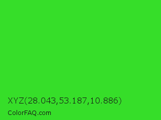 XYZ 28.043,53.187,10.886 Color is a normal green color and the nearest color is Lime Green #32cd32. Hex code #36de29 and RGB value is rgb(54,222,41). In RGB color space, this color is composed of 21% red, 87% green, 16% blue, In CMYK color space, this color is composed of 76% cyan, 0% magenta, 82% yellow , 13% black , In HSL color space, this color has a hue angle of 116° , 73% saturation and 52% lightness.