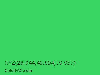 XYZ 28.044,49.894,19.957 Color is a normal green color and the nearest color is UFO Green #3cd070. Hex code #3ad663 and RGB value is rgb(58,214,99). In RGB color space, this color is composed of 23% red, 84% green, 39% blue, In CMYK color space, this color is composed of 73% cyan, 0% magenta, 54% yellow , 16% black , In HSL color space, this color has a hue angle of 136° , 66% saturation and 53% lightness.