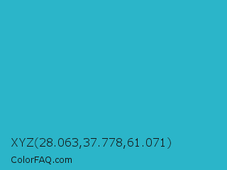 XYZ 28.063,37.778,61.071 Color is a normal cyan color and the nearest color is Ball Blue #21abcd. Hex code #2bb5c9 and RGB value is rgb(43,181,201). In RGB color space, this color is composed of 17% red, 71% green, 79% blue, In CMYK color space, this color is composed of 79% cyan, 10% magenta, 0% yellow , 21% black , In HSL color space, this color has a hue angle of 188° , 65% saturation and 48% lightness.