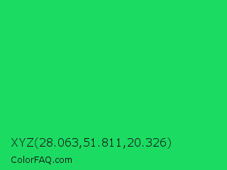 XYZ 28.063,51.811,20.326 Color is a normal green color and the nearest color is Malachite #0bda51. Hex code #1cdb63 and RGB value is rgb(28,219,99). In RGB color space, this color is composed of 11% red, 86% green, 39% blue, In CMYK color space, this color is composed of 87% cyan, 0% magenta, 55% yellow , 14% black , In HSL color space, this color has a hue angle of 142° , 77% saturation and 48% lightness.