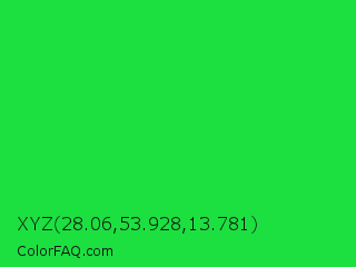 XYZ 28.06,53.928,13.781 Color is a normal green color and the nearest color is Malachite #0bda51. Hex code #1ce040 and RGB value is rgb(28,224,64). In RGB color space, this color is composed of 11% red, 88% green, 25% blue, In CMYK color space, this color is composed of 88% cyan, 0% magenta, 71% yellow , 12% black , In HSL color space, this color has a hue angle of 131° , 78% saturation and 49% lightness.