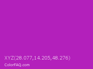 XYZ 28.077,14.205,48.276 Color is a normal magenta color and the nearest color is Byzantine #bd33a4. Hex code #b320bb and RGB value is rgb(179,32,187). In RGB color space, this color is composed of 70% red, 13% green, 73% blue, In CMYK color space, this color is composed of 4% cyan, 83% magenta, 0% yellow , 27% black , In HSL color space, this color has a hue angle of 297° , 71% saturation and 43% lightness.