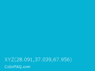 XYZ 28.091,37.039,67.956 Color is a normal cyan color and the nearest color is Cerulean #02a4d3. Hex code #07b3d4 and RGB value is rgb(7,179,212). In RGB color space, this color is composed of 3% red, 70% green, 83% blue, In CMYK color space, this color is composed of 97% cyan, 16% magenta, 0% yellow , 17% black , In HSL color space, this color has a hue angle of 190° , 94% saturation and 43% lightness.