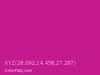 XYZ 28.092,14.458,27.297 Color is a normal magenta color and the nearest color is Red Violet #c71585. Hex code #c41a8f and RGB value is rgb(196,26,143). In RGB color space, this color is composed of 77% red, 10% green, 56% blue, In CMYK color space, this color is composed of 0% cyan, 87% magenta, 27% yellow , 23% black , In HSL color space, this color has a hue angle of 319° , 77% saturation and 44% lightness.