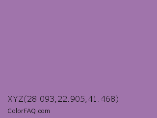XYZ 28.093,22.905,41.468 Color is a normal purple color and the nearest color is Wisteria #9771b5. Hex code #a074ab and RGB value is rgb(160,116,171). In RGB color space, this color is composed of 63% red, 45% green, 67% blue, In CMYK color space, this color is composed of 6% cyan, 32% magenta, 0% yellow , 33% black , In HSL color space, this color has a hue angle of 288° , 25% saturation and 56% lightness.