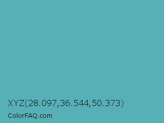 XYZ 28.097,36.544,50.373 Color is a normal cyan color and the nearest color is Fountain Blue #56b4be. Hex code #58b0b7 and RGB value is rgb(88,176,183). In RGB color space, this color is composed of 35% red, 69% green, 72% blue, In CMYK color space, this color is composed of 52% cyan, 4% magenta, 0% yellow , 28% black , In HSL color space, this color has a hue angle of 184° , 40% saturation and 53% lightness.