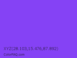 XYZ 28.103,15.476,87.892 Color is a light violet color and the nearest color is Navy Purple #9457eb. Hex code #8542f5 and RGB value is rgb(133,66,245). In RGB color space, this color is composed of 52% red, 26% green, 96% blue, In CMYK color space, this color is composed of 46% cyan, 73% magenta, 0% yellow , 4% black , In HSL color space, this color has a hue angle of 262° , 90% saturation and 61% lightness.