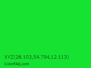 XYZ 28.103,54.794,12.113 Color is a normal green color and the nearest color is Vivid Malachite #00cc33. Hex code #16e232 and RGB value is rgb(22,226,50). In RGB color space, this color is composed of 9% red, 89% green, 20% blue, In CMYK color space, this color is composed of 90% cyan, 0% magenta, 78% yellow , 11% black , In HSL color space, this color has a hue angle of 128° , 82% saturation and 49% lightness.