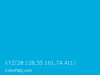 XYZ 28.128,35.161,74.411 Color is a normal cyan color and the nearest color is Cerulean #02a4d3. Hex code #00adde and RGB value is rgb(0,173,222). In RGB color space, this color is composed of 0% red, 68% green, 87% blue, In CMYK color space, this color is composed of 100% cyan, 22% magenta, 0% yellow , 13% black , In HSL color space, this color has a hue angle of 193° , 100% saturation and 44% lightness.