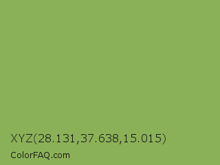XYZ 28.131,37.638,15.015 Color is a normal green color and the nearest color is Chelsea Cucumber #83aa5d. Hex code #8bb158 and RGB value is rgb(139,177,88). In RGB color space, this color is composed of 55% red, 69% green, 35% blue, In CMYK color space, this color is composed of 21% cyan, 0% magenta, 50% yellow , 31% black , In HSL color space, this color has a hue angle of 86° , 36% saturation and 52% lightness.