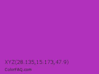XYZ 28.135,15.173,47.9 Color is a normal magenta color and the nearest color is Byzantine #bd33a4. Hex code #b132ba and RGB value is rgb(177,50,186). In RGB color space, this color is composed of 69% red, 20% green, 73% blue, In CMYK color space, this color is composed of 5% cyan, 73% magenta, 0% yellow , 27% black , In HSL color space, this color has a hue angle of 296° , 58% saturation and 46% lightness.