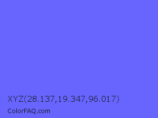 XYZ 28.137,19.347,96.017 Color is a light indigo color and the nearest color is Very Light Blue #6666ff. Hex code #6765fe and RGB value is rgb(103,101,254). In RGB color space, this color is composed of 40% red, 40% green, 100% blue, In CMYK color space, this color is composed of 59% cyan, 60% magenta, 0% yellow , 0% black , In HSL color space, this color has a hue angle of 241° , 99% saturation and 70% lightness.