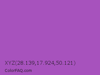 XYZ 28.139,17.924,50.121 Color is a normal purple color and the nearest color is Purple Plum #9c51b6. Hex code #a752bd and RGB value is rgb(167,82,189). In RGB color space, this color is composed of 65% red, 32% green, 74% blue, In CMYK color space, this color is composed of 12% cyan, 57% magenta, 0% yellow , 26% black , In HSL color space, this color has a hue angle of 288° , 45% saturation and 53% lightness.