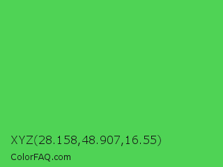 XYZ 28.158,48.907,16.55 Color is a normal green color and the nearest color is UFO Green #3cd070. Hex code #4fd355 and RGB value is rgb(79,211,85). In RGB color space, this color is composed of 31% red, 83% green, 33% blue, In CMYK color space, this color is composed of 63% cyan, 0% magenta, 60% yellow , 17% black , In HSL color space, this color has a hue angle of 123° , 60% saturation and 57% lightness.