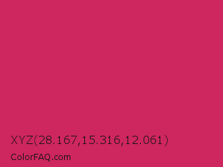 XYZ 28.167,15.316,12.061 Color is a normal rose color and the nearest color is Rose Red #c21e56. Hex code #ce265e and RGB value is rgb(206,38,94). In RGB color space, this color is composed of 81% red, 15% green, 37% blue, In CMYK color space, this color is composed of 0% cyan, 82% magenta, 54% yellow , 19% black , In HSL color space, this color has a hue angle of 340° , 69% saturation and 48% lightness.