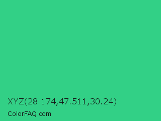 XYZ 28.174,47.511,30.24 Color is a normal green color and the nearest color is Shamrock #33cc99. Hex code #32d086 and RGB value is rgb(50,208,134). In RGB color space, this color is composed of 20% red, 82% green, 53% blue, In CMYK color space, this color is composed of 76% cyan, 0% magenta, 36% yellow , 18% black , In HSL color space, this color has a hue angle of 152° , 63% saturation and 51% lightness.