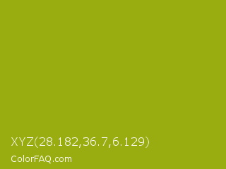 XYZ 28.182,36.7,6.129 Color is a normal yellow color and the nearest color is Citron #9fa91f. Hex code #99ad11 and RGB value is rgb(153,173,17). In RGB color space, this color is composed of 60% red, 68% green, 7% blue, In CMYK color space, this color is composed of 12% cyan, 0% magenta, 90% yellow , 32% black , In HSL color space, this color has a hue angle of 68° , 82% saturation and 37% lightness.