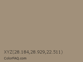 XYZ 28.184,28.929,22.511 Color is a normal orange color and the nearest color is Donkey Brown #a69279. Hex code #a1907a and RGB value is rgb(161,144,122). In RGB color space, this color is composed of 63% red, 56% green, 48% blue, In CMYK color space, this color is composed of 0% cyan, 11% magenta, 24% yellow , 37% black , In HSL color space, this color has a hue angle of 34° , 17% saturation and 55% lightness.