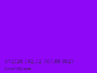 XYZ 28.192,12.707,88.962 Color is a normal purple color and the nearest color is Electric Violet #8f00ff. Hex code #8f07f7 and RGB value is rgb(143,7,247). In RGB color space, this color is composed of 56% red, 3% green, 97% blue, In CMYK color space, this color is composed of 42% cyan, 97% magenta, 0% yellow , 3% black , In HSL color space, this color has a hue angle of 274° , 94% saturation and 50% lightness.