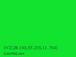 XYZ 28.193,55.255,11.764 Color is a normal green color and the nearest color is Vivid Malachite #00cc33. Hex code #11e32e and RGB value is rgb(17,227,46). In RGB color space, this color is composed of 7% red, 89% green, 18% blue, In CMYK color space, this color is composed of 93% cyan, 0% magenta, 80% yellow , 11% black , In HSL color space, this color has a hue angle of 128° , 86% saturation and 48% lightness.