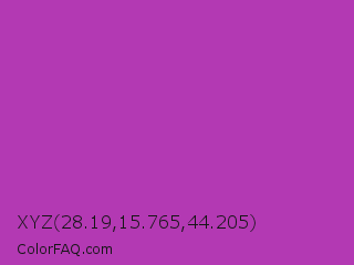 XYZ 28.19,15.765,44.205 Color is a normal magenta color and the nearest color is Byzantine #bd33a4. Hex code #b339b3 and RGB value is rgb(179,57,179). In RGB color space, this color is composed of 70% red, 22% green, 70% blue, In CMYK color space, this color is composed of 0% cyan, 68% magenta, 0% yellow , 30% black , In HSL color space, this color has a hue angle of 300° , 52% saturation and 46% lightness.