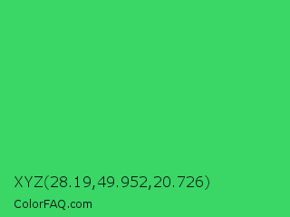 XYZ 28.19,49.952,20.726 Color is a normal green color and the nearest color is UFO Green #3cd070. Hex code #3ad666 and RGB value is rgb(58,214,102). In RGB color space, this color is composed of 23% red, 84% green, 40% blue, In CMYK color space, this color is composed of 73% cyan, 0% magenta, 52% yellow , 16% black , In HSL color space, this color has a hue angle of 137° , 66% saturation and 53% lightness.