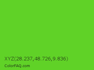 XYZ 28.237,48.726,9.836 Color is a normal green color and the nearest color is Harlequin Green #46cb18. Hex code #60d227 and RGB value is rgb(96,210,39). In RGB color space, this color is composed of 38% red, 82% green, 15% blue, In CMYK color space, this color is composed of 54% cyan, 0% magenta, 81% yellow , 18% black , In HSL color space, this color has a hue angle of 100° , 69% saturation and 49% lightness.