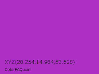 XYZ 28.254,14.984,53.628 Color is a normal purple color and the nearest color is Dark Orchid #9932cc. Hex code #ad30c4 and RGB value is rgb(173,48,196). In RGB color space, this color is composed of 68% red, 19% green, 77% blue, In CMYK color space, this color is composed of 12% cyan, 76% magenta, 0% yellow , 23% black , In HSL color space, this color has a hue angle of 291° , 61% saturation and 48% lightness.