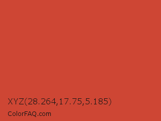 XYZ 28.264,17.75,5.185 Color is a normal red color and the nearest color is Valencia #d84437. Hex code #ce4634 and RGB value is rgb(206,70,52). In RGB color space, this color is composed of 81% red, 27% green, 20% blue, In CMYK color space, this color is composed of 0% cyan, 66% magenta, 75% yellow , 19% black , In HSL color space, this color has a hue angle of 7° , 61% saturation and 51% lightness.