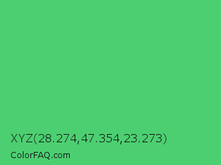 XYZ 28.274,47.354,23.273 Color is a normal green color and the nearest color is Emerald #50c878. Hex code #4ccf71 and RGB value is rgb(76,207,113). In RGB color space, this color is composed of 30% red, 81% green, 44% blue, In CMYK color space, this color is composed of 63% cyan, 0% magenta, 45% yellow , 19% black , In HSL color space, this color has a hue angle of 137° , 58% saturation and 55% lightness.