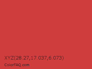 XYZ 28.27,17.037,6.073 Color is a normal red color and the nearest color is Jasper #d73b3e. Hex code #cf3e3c and RGB value is rgb(207,62,60). In RGB color space, this color is composed of 81% red, 24% green, 24% blue, In CMYK color space, this color is composed of 0% cyan, 70% magenta, 71% yellow , 19% black , In HSL color space, this color has a hue angle of 1° , 60% saturation and 52% lightness.