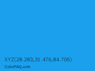 XYZ 28.283,31.476,84.706 Color is a normal blue color and the nearest color is Button Blue #24a0ed. Hex code #1aa0ed and RGB value is rgb(26,160,237). In RGB color space, this color is composed of 10% red, 63% green, 93% blue, In CMYK color space, this color is composed of 89% cyan, 32% magenta, 0% yellow , 7% black , In HSL color space, this color has a hue angle of 202° , 85% saturation and 52% lightness.