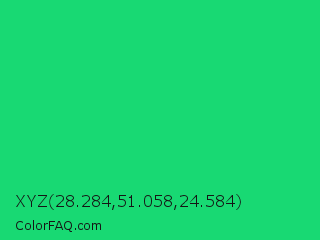 XYZ 28.284,51.058,24.584 Color is a normal green color and the nearest color is Malachite #0bda51. Hex code #18d973 and RGB value is rgb(24,217,115). In RGB color space, this color is composed of 9% red, 85% green, 45% blue, In CMYK color space, this color is composed of 89% cyan, 0% magenta, 47% yellow , 15% black , In HSL color space, this color has a hue angle of 148° , 80% saturation and 47% lightness.