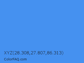 XYZ 28.308,27.807,86.313 Color is a light blue color and the nearest color is Blueberry #4f86f7. Hex code #4591f0 and RGB value is rgb(69,145,240). In RGB color space, this color is composed of 27% red, 57% green, 94% blue, In CMYK color space, this color is composed of 71% cyan, 40% magenta, 0% yellow , 6% black , In HSL color space, this color has a hue angle of 213° , 85% saturation and 61% lightness.