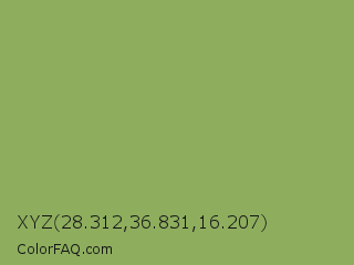 XYZ 28.312,36.831,16.207 Color is a normal green color and the nearest color is Chelsea Cucumber #83aa5d. Hex code #8eae5e and RGB value is rgb(142,174,94). In RGB color space, this color is composed of 56% red, 68% green, 37% blue, In CMYK color space, this color is composed of 18% cyan, 0% magenta, 46% yellow , 32% black , In HSL color space, this color has a hue angle of 84° , 33% saturation and 53% lightness.