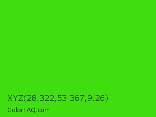 XYZ 28.322,53.367,9.26 Color is a normal green color and the nearest color is Harlequin Green #46cb18. Hex code #40de0f and RGB value is rgb(64,222,15). In RGB color space, this color is composed of 25% red, 87% green, 6% blue, In CMYK color space, this color is composed of 71% cyan, 0% magenta, 93% yellow , 13% black , In HSL color space, this color has a hue angle of 106° , 87% saturation and 46% lightness.
