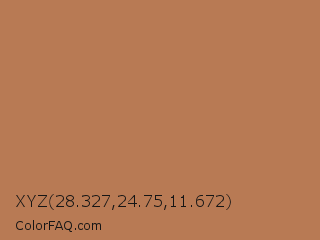 XYZ 28.327,24.75,11.672 Color is a normal orange color and the nearest color is Deer #ba8759. Hex code #b87a54 and RGB value is rgb(184,122,84). In RGB color space, this color is composed of 72% red, 48% green, 33% blue, In CMYK color space, this color is composed of 0% cyan, 34% magenta, 54% yellow , 28% black , In HSL color space, this color has a hue angle of 23° , 41% saturation and 53% lightness.