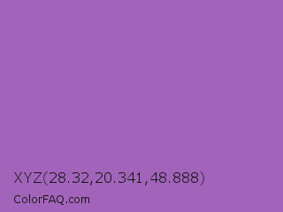 XYZ 28.32,20.341,48.888 Color is a normal purple color and the nearest color is Deep Lilac #9955bb. Hex code #a264ba and RGB value is rgb(162,100,186). In RGB color space, this color is composed of 64% red, 39% green, 73% blue, In CMYK color space, this color is composed of 13% cyan, 46% magenta, 0% yellow , 27% black , In HSL color space, this color has a hue angle of 283° , 38% saturation and 56% lightness.