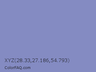 XYZ 28.33,27.186,54.793 Color is a light blue color and the nearest color is Ship Cove #788bba. Hex code #838bc2 and RGB value is rgb(131,139,194). In RGB color space, this color is composed of 51% red, 55% green, 76% blue, In CMYK color space, this color is composed of 32% cyan, 28% magenta, 0% yellow , 24% black , In HSL color space, this color has a hue angle of 232° , 34% saturation and 64% lightness.