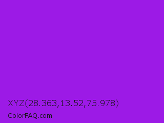 XYZ 28.363,13.52,75.978 Color is a normal purple color and the nearest color is Veronica #a020f0. Hex code #9c1ae6 and RGB value is rgb(156,26,230). In RGB color space, this color is composed of 61% red, 10% green, 90% blue, In CMYK color space, this color is composed of 32% cyan, 89% magenta, 0% yellow , 10% black , In HSL color space, this color has a hue angle of 278° , 80% saturation and 50% lightness.