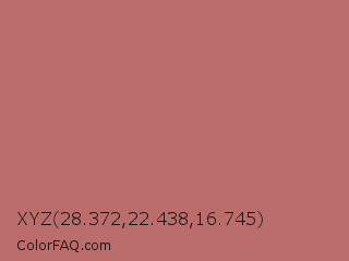 XYZ 28.372,22.438,16.745 Color is a normal red color and the nearest color is Contessa #c6726b. Hex code #ba6d6b and RGB value is rgb(186,109,107). In RGB color space, this color is composed of 73% red, 43% green, 42% blue, In CMYK color space, this color is composed of 0% cyan, 41% magenta, 42% yellow , 27% black , In HSL color space, this color has a hue angle of 2° , 36% saturation and 57% lightness.
