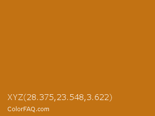 XYZ 28.375,23.548,3.622 Color is a normal orange color and the nearest color is Bourbon #ba6f1e. Hex code #c27212 and RGB value is rgb(194,114,18). In RGB color space, this color is composed of 76% red, 45% green, 7% blue, In CMYK color space, this color is composed of 0% cyan, 41% magenta, 91% yellow , 24% black , In HSL color space, this color has a hue angle of 33° , 83% saturation and 42% lightness.