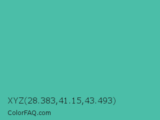XYZ 28.383,41.15,43.493 Color is a normal cyan color and the nearest color is Puerto Rico #3fc1aa. Hex code #4bbea8 and RGB value is rgb(75,190,168). In RGB color space, this color is composed of 29% red, 75% green, 66% blue, In CMYK color space, this color is composed of 61% cyan, 0% magenta, 12% yellow , 25% black , In HSL color space, this color has a hue angle of 169° , 47% saturation and 52% lightness.