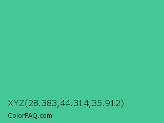 XYZ 28.383,44.314,35.912 Color is a normal green color and the nearest color is Ocean Green #48bf91. Hex code #45c796 and RGB value is rgb(69,199,150). In RGB color space, this color is composed of 27% red, 78% green, 59% blue, In CMYK color space, this color is composed of 65% cyan, 0% magenta, 25% yellow , 22% black , In HSL color space, this color has a hue angle of 157° , 54% saturation and 53% lightness.